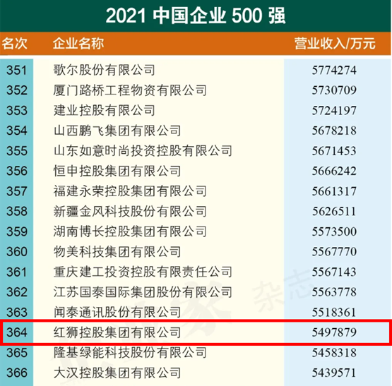 腾博会集团位列2021中国企业500强第364位、 中国制造业企业500强第171位